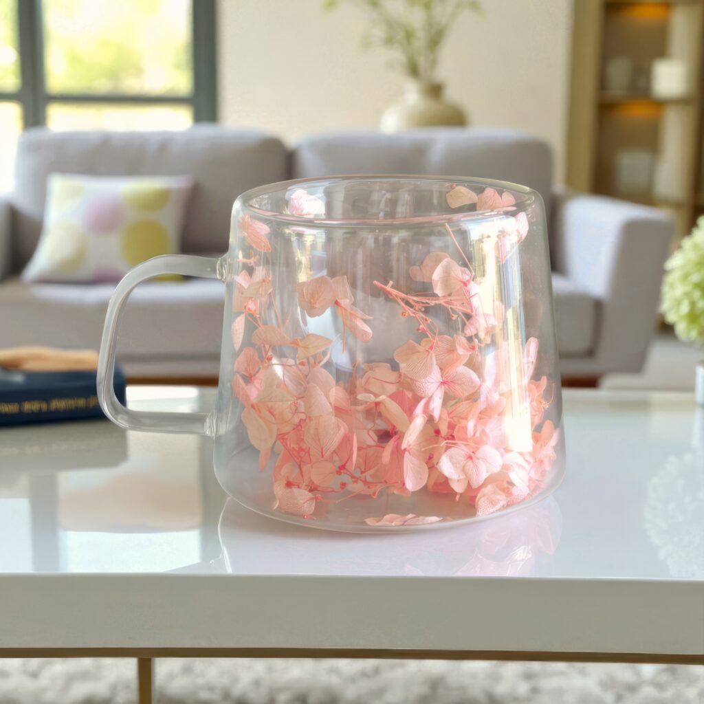 We wnętrzu podwójnych ścianek tej niezwykłej szklanki znajdują się kwiaty gipsówki – dzięki temu wygląda, jakby unosił się w niej mały kwiatowy ogród.