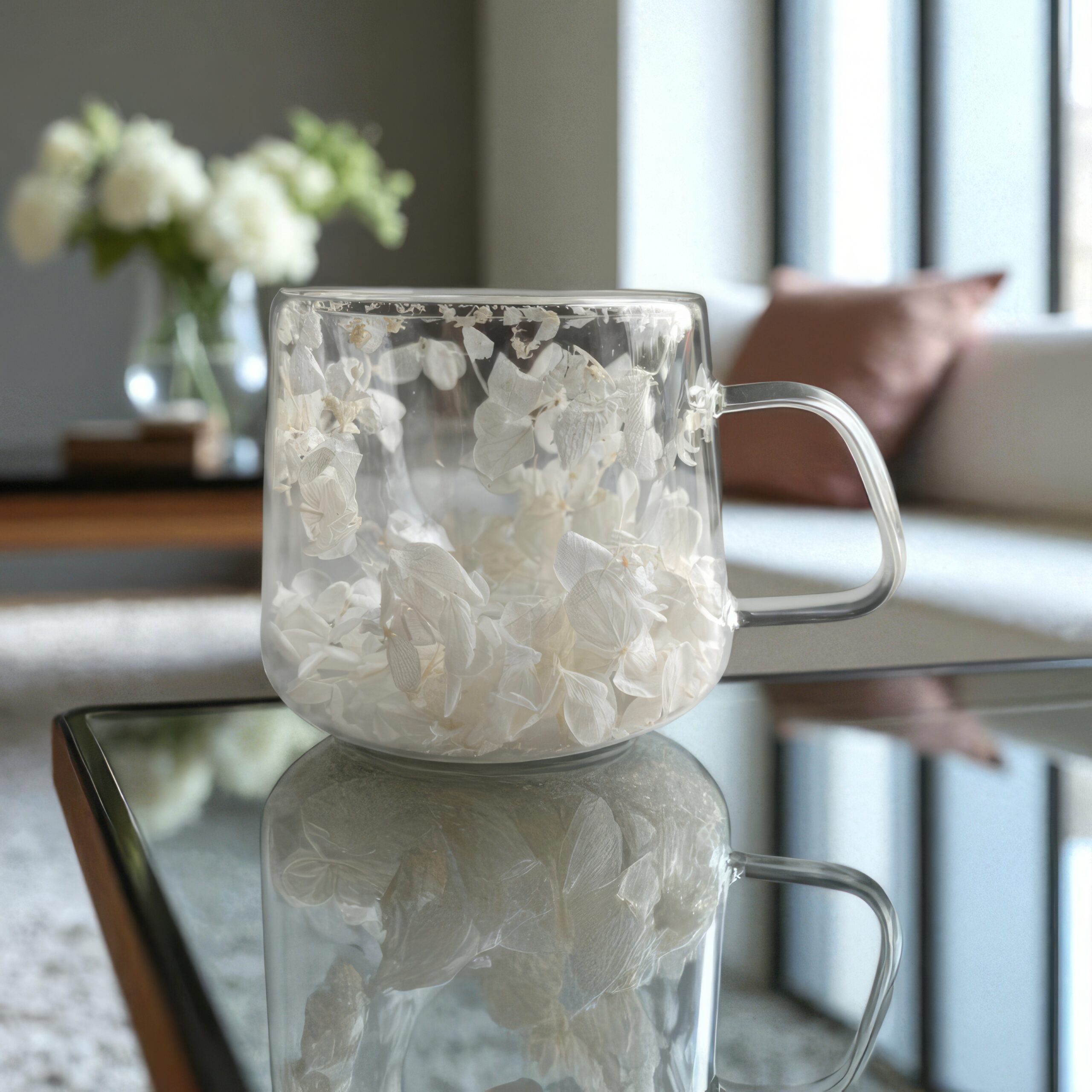 We wnętrzu podwójnych ścianek tej niezwykłej szklanki znajdują się kwiaty gipsówki – dzięki temu wygląda, jakby unosił się w niej mały kwiatowy ogród.
